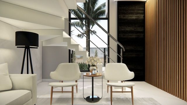 2º pav: 3 quartos, sendo 1 suite master com closet e sacada, escadas revestidas.